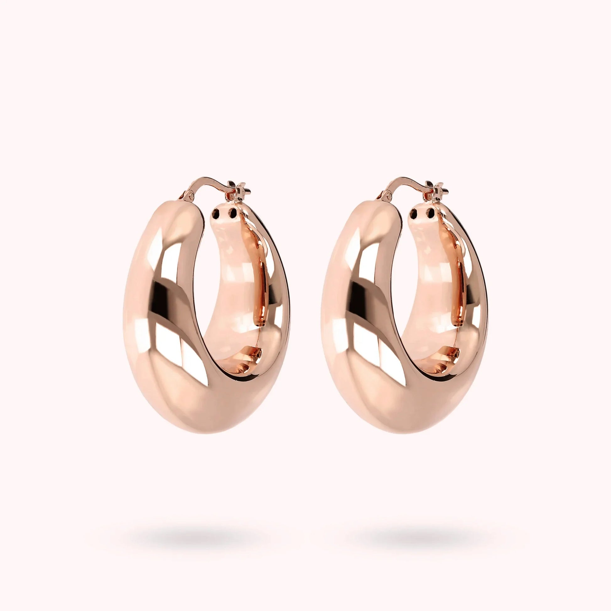 Orecchini pendenti a cerchio bombato Bronzallure realizzati in lega Golden Rosé, placcati oro rosa 18kt; chiusura a baionetta. Diametro esterno 3.3 cm.
